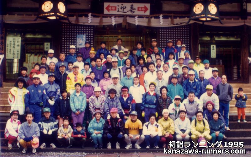 | ●第12回初詣ランニング 昭和64年(1989年)1月2日(月)。快晴。 【神社仏閣巡り】参加者:51名(男29名、女17名、会員外5名)。トレーナー:野村泰裕。 【白山コース】午後の部は鶴来白山さんへ参拝。15名参加。11:00市営プール前を出発。MROが密着取材。ニュースで放映した。 |
