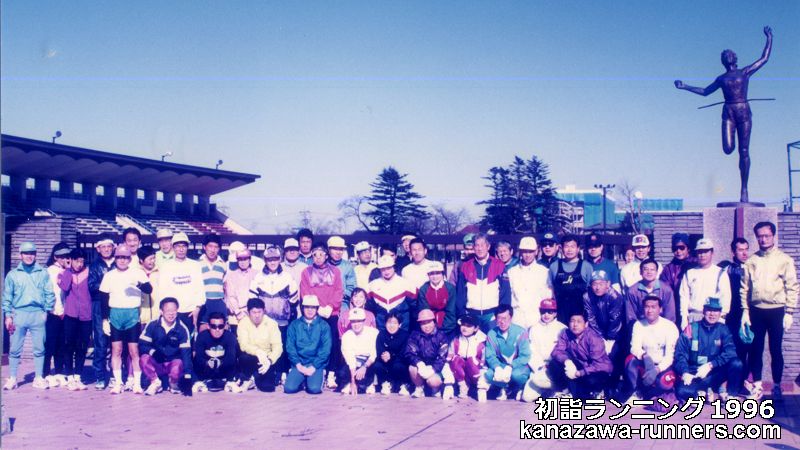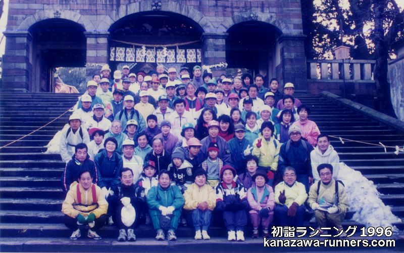| ●第19回初詣ランニング 平成8年(1996年)1月2日(木)。 【参加者】82名(男41名、女16名、会員外約25名)。白山詣53名。 【コース】県体育館〜@尾山神社〜A尾崎神社〜B市姫神社〜C金沢東別院〜D鍛治八幡神社〜E久保市乙剣宮〜F椿原〜G石川護国神社〜H金沢神社〜I石浦神社〜兼六園下(曲水宴) |