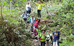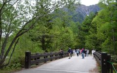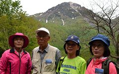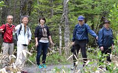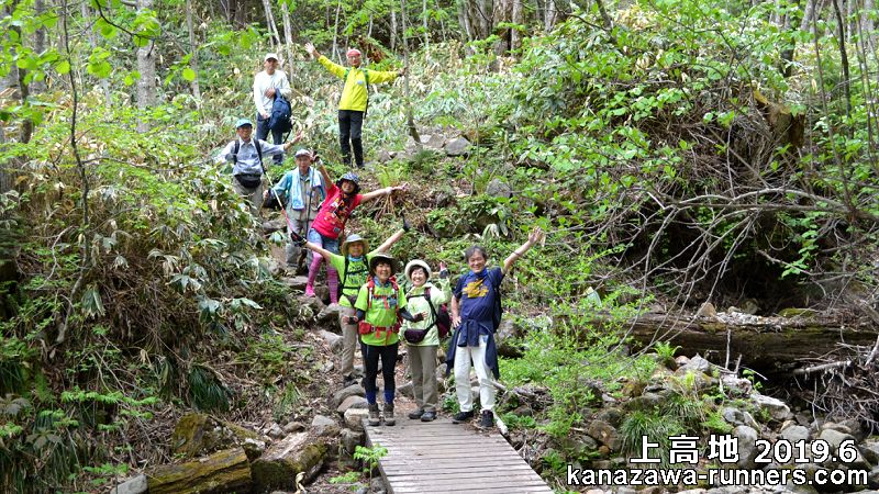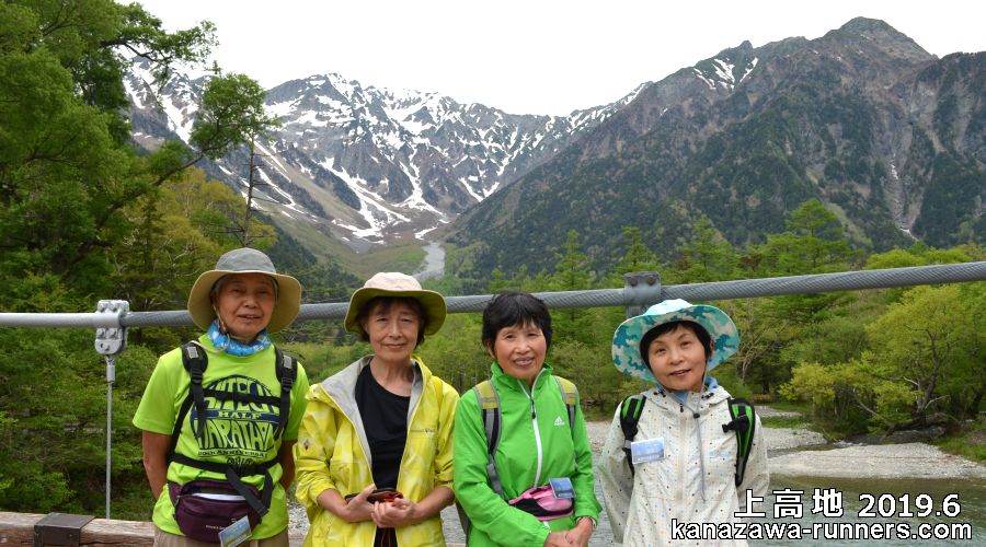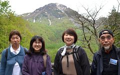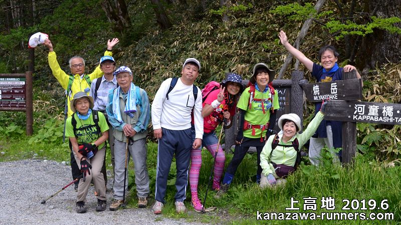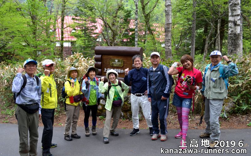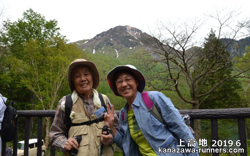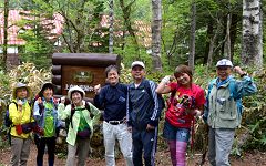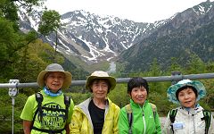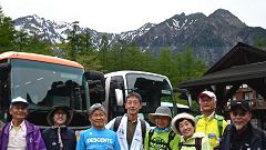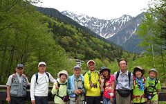 | 新緑の上高地を楽しむ=この集合写真は平湯バスターミナルで撮影。 |