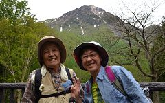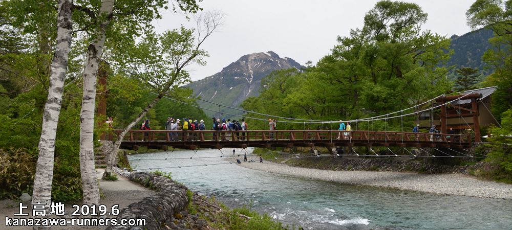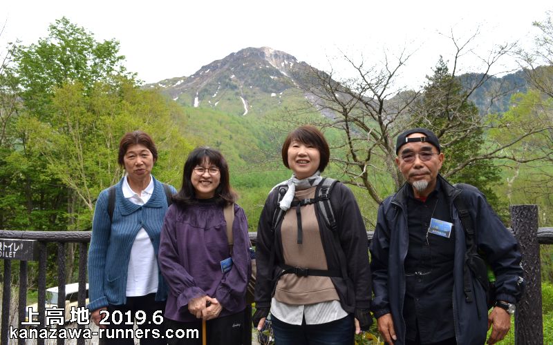 | 懇親会を兼ねたバス旅行。新緑の上高地でランニング・トレッキング・散策を楽しみました。現地では楽しむコースで下車位置が違うため、参加者の集合写真は平湯バスターミナルで撮影します。背景に見えるのは乗鞍岳です。 |