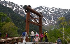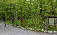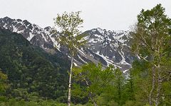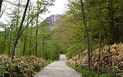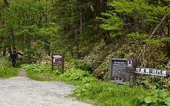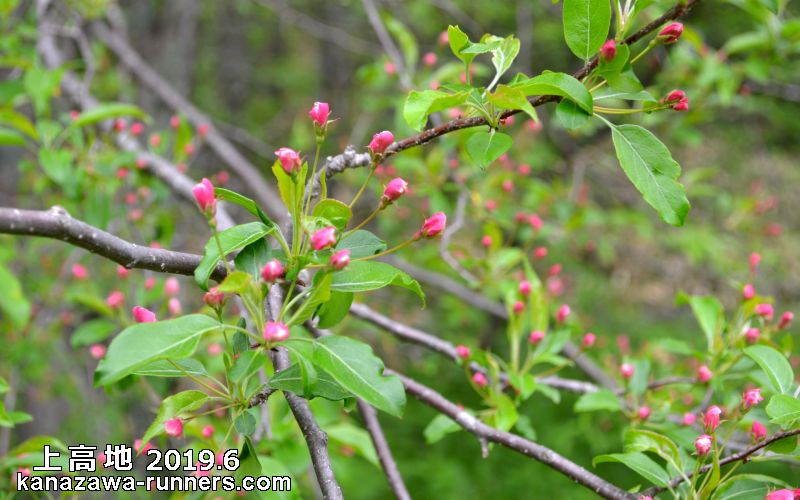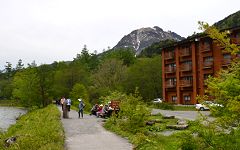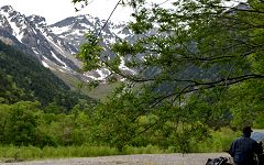 | 上高地では3班に別れて行動です。@大正池〜田代湿原〜河童橋の散策。A河童橋〜明神〜徳沢園の散策。B大正池〜徳沢園のジョギングC焼岳登山(バス出発時間に間に合うところまで)。 バス旅行の幹事は編集長です。皆さんを送り出したあと、小梨平周辺でコナシ(ズミ)の花を撮影してから、河童橋を渡り梓川右岸を焼岳登山組を追いかけるものです。 |