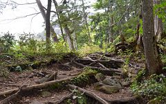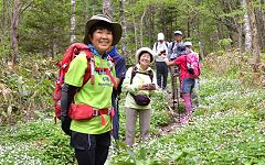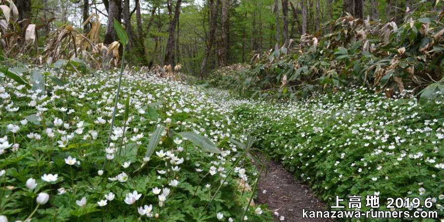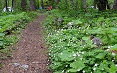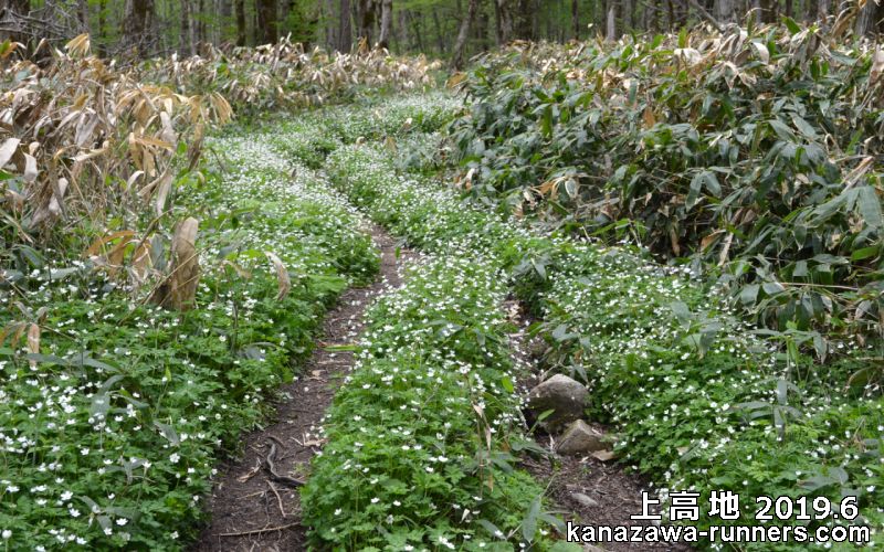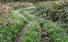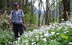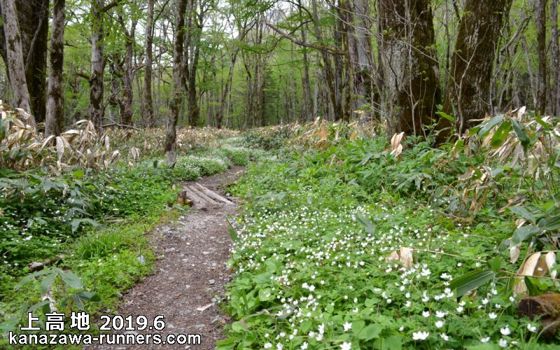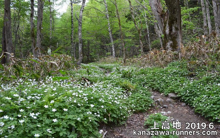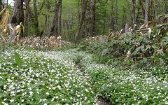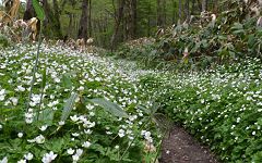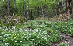 | 焼岳の登山路の両側に、ニリンソウの群落。 | ||