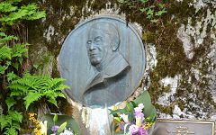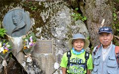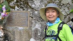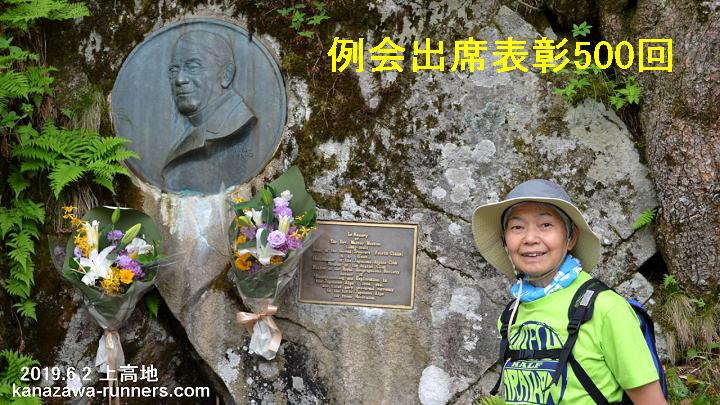 | 当会には例会出席表制度があります。Hさんは今回の旅行日が500回目となりました。バスの車内で表彰しました。記念撮影はウェストン・レリーフの前を予定します。焼岳登山の帰路に撮影しました。 | ||