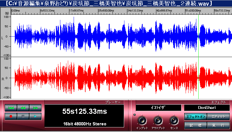 ●泉野おどりに使用する音源制作 会場で流す曲は、私が2019年に編集した音源CDを使っています。炭坑節や百万石音頭などの原曲は3分前後で、踊るには短い。そこで5〜6分になるように編集する。曲は前奏・歌・エンディングで構成される。これを前奏・歌1・歌2・エンディングと歌部分を2〜3回繰り返して長くする。 これまで使用していた音源はテープ録音したものを切り継ぎして制作していたようです。接続部が耳障りでリズムもズレている。初めて耳にしオヤッと思い、2回目からはよくもこれで長年踊り続けていたものだと気になってしょうがなかった。 |