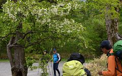 さて、会のバス旅行=上高地は3回目となりました。最初(2007年)は河童橋〜岳沢ヒュッテまで登山、2回目(2011年)は河童橋〜明神〜徳沢園への散策。今回は田代湿原・岳沢湿原とエリアを変えて楽しみます。6月第一日曜日に開催されるウェストン祭。当日、上高地にいても観る機会がありませんでした。今回は見学する時間をつくろう。バス旅行の幹事は編集長です。皆さんをバスターミナルで見送ってから行動開始。河童橋〜田代湿原〜河童橋〜岳沢湿原〜岳沢登山路〜河童橋とコース取りして、記憶に残すような感覚で撮影を楽しみます。散策・ラン・登山の各班が今どの辺りにいるか見当をつけています。予定とおり、各班の様子を撮影できました。 この時期に楽しむ花は小梨とニリンソウ。前回は徳沢園のニリンソウを撮影。今回は小梨の花を撮影します。河童橋奥の小梨平の地名は、この小梨からとったものです。気付かなかった皆さんも多いと思います。写真で楽しんでください。 |
