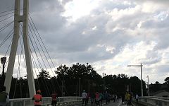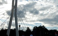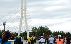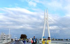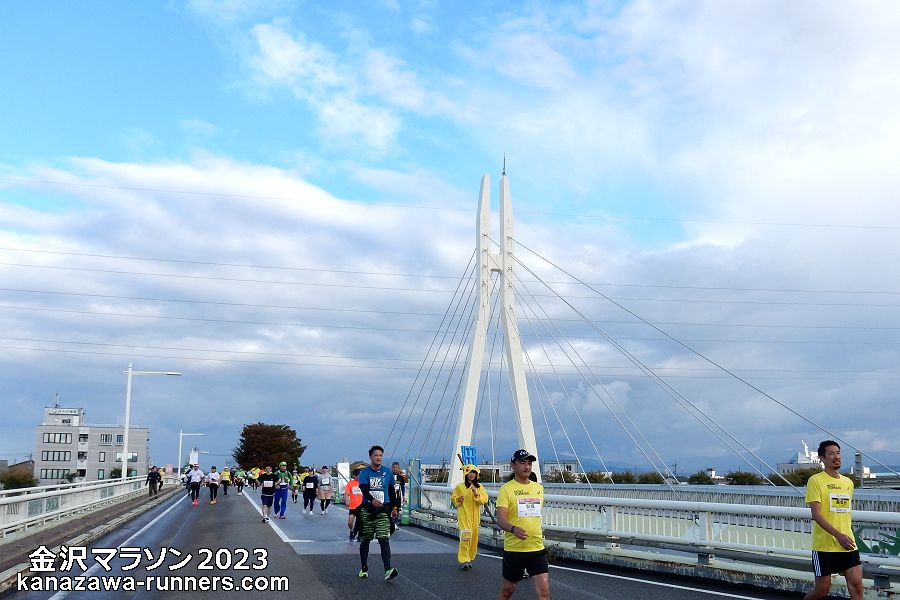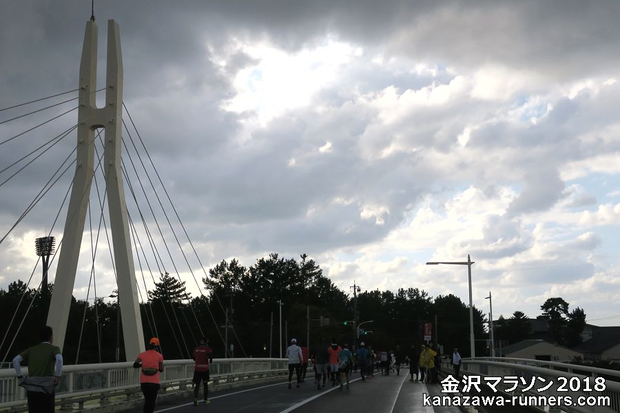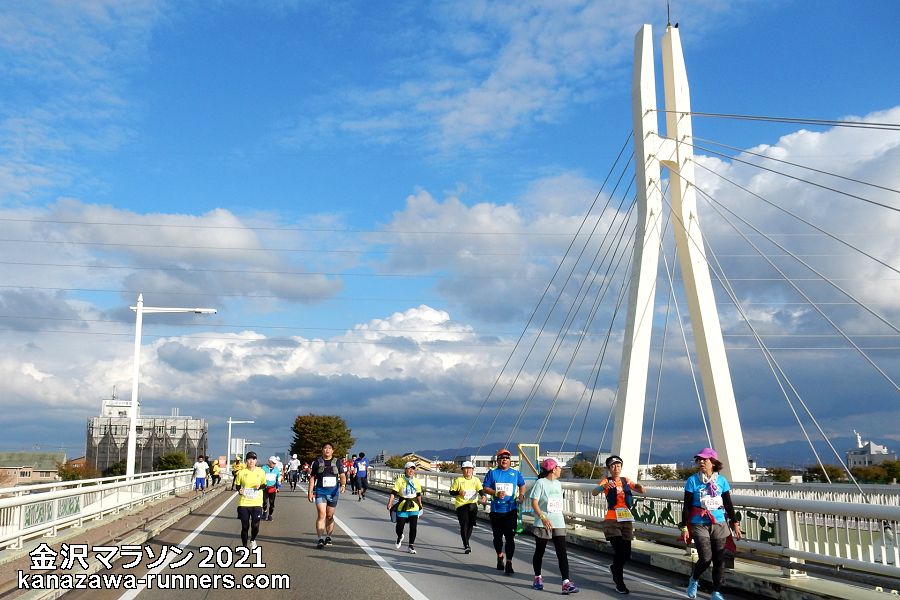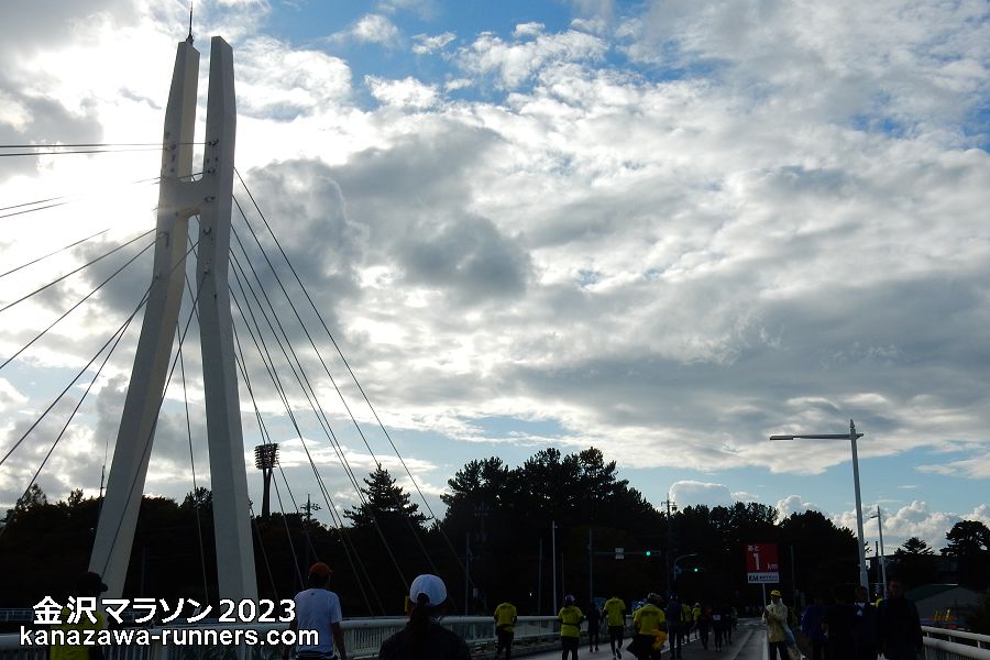 雪吊橋は、フィニッシュ1km前の地点です。歩行者専用橋で、走路は示野大橋を渡ります。斜張橋の造形を組み込めるので撮影スポットのひとつとしています。犀川を東西に架かっているので、進行方向は夕刻の太陽で逆光になります。橋を渡ってから東方向が撮影チャンス。その時、空模様はどうなっているか。ランナーの人数・配置も気になります。 |