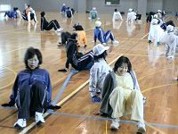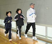 | A練習風景:2005年最後の例会です。体育館の室温は3℃。晴れてきましたが積雪で走路状況が悪いので体育館での周回ランニングです。最後に和田さんの音頭で手締め。 次回例会は1月8日(日)です。 来年も元気でお会いしましょう。 |