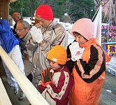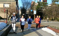 | 初詣ランニングは、一年の健康を祈願しながら親睦を深める新年恒例の行事です。 午前7時開始の市内社寺巡りコースは、ニューヨークから帰省中のNさん夫妻や白山市からの家族連れなど新たな仲間も増え、120余名の参加で盛況のうちに開催できました。途中から小雨の交じる天候となりましたが、ゴールの兼六園下『曲水苑』でぜんざいをいただき、走り初めを楽しみました。11時開始の白山比盗_社コースは、昨年末からの積雪のため初の中止となりました。 |