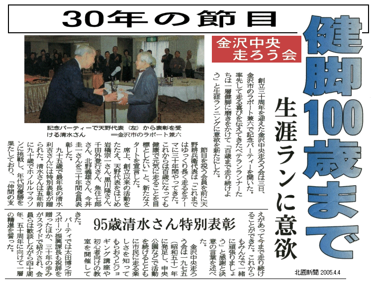 ■2005年度総会:12:00〜12:45@昨年度の活動報告と会計報告 A今年度の活動計画と予算・役員 B年間出席優秀表彰 ■30周年記念パーティ:13:00〜15:00 会場:ラポート兼六 @会長挨拶 A30年のあゆみ紹介 B来賓挨拶(金沢市文化スポーツ局スポーツ振興課長 太田博之殿) C30周年表彰 D会員のランニングライフ紹介 |