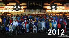 | 【記念撮影】 集合場所を真っ先に出発し、尾山神社に走ります。追いついてくるランナーを撮影し、山門の前でカメラを構えます。山門をのぼるランナーを撮影した後、本殿前に移動。三脚を組み立てカメラをセットします。整列する間に試し撮り。フラッシュは使えないので、周囲の照明を利用した長時間露光で撮影。十数枚撮影し、使えるのはわずか2〜3枚です。 三脚をたたみ、カメラに防水ケースを取付けて、ランナーを追います。 |