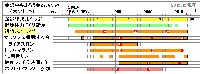 | 【中断無く継続しています】 金沢中央走ろう会の創設は、1975年4月。3年目から始まった行事が、降雪や雨天などの天候に合いながらも続いています。 |