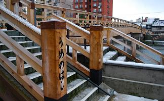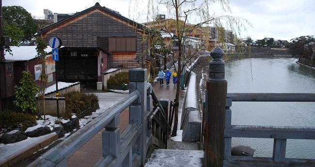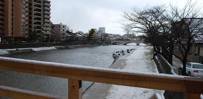 | 今年のF宇多須神社〜G石川護国神社へは天神橋を渡るコースです。 私は、撮影で最後尾になったことから、梅の橋に寄り道しました。 中の橋・梅の橋は木造の橋。雪景色はどうなっているか撮影するためです。早朝の浅野川の景色を楽しんでから、皆さんの後を追います。 来年(2010年)は梅の橋を渡るコースです。 |