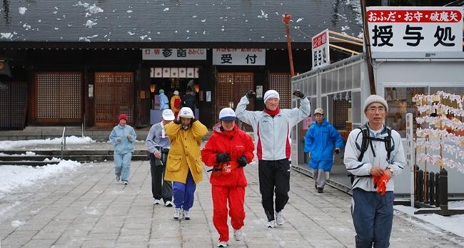 | 2009年の走り初めは、市内10社寺を巡る初詣でランニングです。市内の10社寺を巡り、一年の健康を祈願しながら親睦を深めます。家族連れも多く新たな仲間も増え、130名の参加で盛況のうちに開催できました。 年末から冬型の気圧配置になり、断続的な降雪の正月です。早朝はミゾレ模様でしたがランニングには支障のないものでした。道路や神社の石段には雪が残って、注意しながらのランニングです。今年は、7番目の神社が宇多須神社に代わりました。浅野川にかかる中ノ橋・梅ノ橋の2つの木造橋がコース近くにあり、風情を楽しみます。フィニッシュ会場の兼六園下『曲水宴』でぜんざいをいただきました。 尾山神社での記念写真。左に当会の旗が写っています。今回新しく制作したもので、初のお目見えです。当会の開催行事などに使用していきます。 |