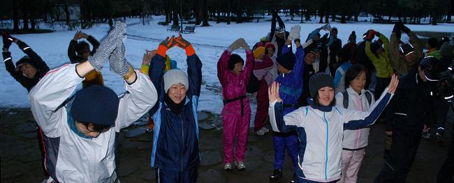 | 集合は中央公園。野村幹事長の指導で準備体操 | |