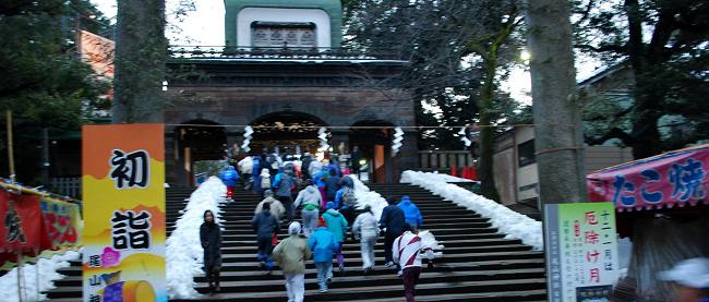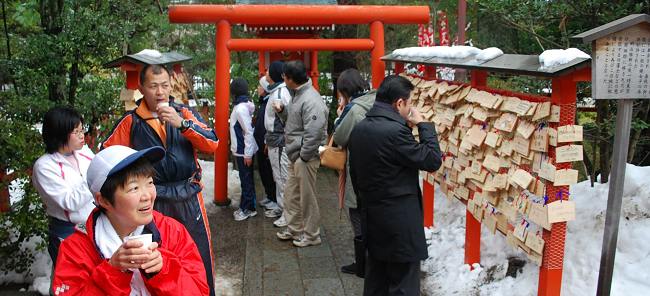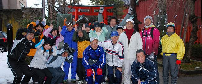 | 2011年の走り初めは、初詣でランニングです。市内の10社寺を巡り、一年の健康を祈願しながら親睦を深めます。家族連れも多く新たな仲間も増え、133名の参加で盛況のうちに開催できました。 年末から冬型の気圧配置になり、断続的な降雪の正月です。年末の予報では雪でしたが、曇りから晴れの走り初めには好天となりました。道路や神社の石段には雪が残って、注意しながらのランニングです。鍛治八幡神社から久保市乙剣宮へは浅野川沿いに主計町、ひがし茶屋街を通って宇多須神社へ。浅野川にかかる中ノ橋・梅ノ橋の2つの木造橋など雪景色の風情を楽しみます。フィニッシュは兼六園下。茶房『曲水宴』でぜんざいをいただきました。 |