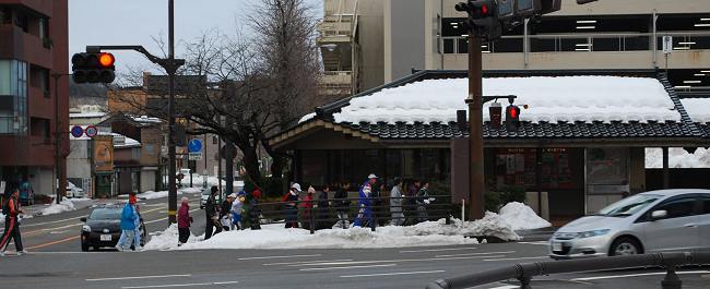 ◇ことしの心構えも、『遊びごころ と 学ぶこころ』。撮影ランを楽しむ。 初詣ランニングのスタート会場は中央公園です。天気予報は曇り。雪や雨の心配がないのが何よりです。撮影装備一式をリュックに詰め、中央公園まで40分弱のウォーキングです。今回は尾山神社で不要になる三脚を預かってもらう段取りができています。いつもの練習会場は雪一面です。参加者の元気な顔がいっぱいです。 今回、一般参加者から会費200円をいただくことになりました。近年、会員より一般参加の方が多くなっています。フィニッシュ会場での『ぜんざい』代の一部に当てるものです。参加者証(ぜんざい引換券)の発行で人数確認が迅速になりました。参加133名はこれまでの最多です。 新たな顔が増えています。ビックリしたのは七尾市からの参加者があったことです。Fさんとは昨年9月、乗鞍岳登山のバスで一緒になりました。当会の行事を紹介したところ10月の健康ランニング大会に参加してくれました。小規模の家族的な大会に七尾からきてくれたのは嬉しいできごとです。今回は梅ノ橋で合流、『アラッ、来てたの』。『楽しんでいます』。以降の集合写真に加わっています。 中央公園の撮影も、出発の頃合いを見計らって、尾山神社に先回りして三脚などの準備をします。今回は皆さんのスタートと一緒になったので公園から通りに出る出発シーンを撮る余裕もなく、背中のリュックをゆすりながら、急ぎます。尾山神社の山門の前で階段を上るランナーを狙います。集合の記念撮影はストロボを使わない長時間露光のため何枚も撮影します。遅れて来る参加者もあるので、けっこう時間がかかっています。薄暗いといっても好天のおかげか、撮影のISO感度を400に設定したおかげか、参加者の身動きによるブレのない写真になっています。 @尾山神社を撮影後、Nさん宅に寄り三脚を預けます。防寒服を脱ぎ、撮影機材はサブザックに入れ替えます。A尾崎神社の境内で撮影してB市姫神社に急ぎます。ここで道路を走るランナー写真を確保。市姫神社の小さな境内に列ができています。N幹事長は最後尾でランナーを見守り、Nさんはフィニッシュ会場の準備と役割を確認します。C金沢東別院・D鍛治八幡神社をとばして、E久保市乙剣宮に向かいます。久保市さんはとても静か。トップはまだ来ていないようです。暗闇坂を降りて、浅野川に出ます。中ノ橋で参加者の来るのを待ちます。ここで橋と主計町の木造建物を背景に河岸を走る参加者を狙います。久保市さんへの入り口を通り越す人もいるので誘導します。神社のもどって撮影し、東茶屋街に向かいます。門松を組み込む構図で町並みを走る参加者を狙います。F宇多須神社で待っていると、30人を超す記念写真になりました。梅ノ橋を渡り、天神橋まで浅野川沿い走り兼六園下に向かいます。フィニッシュ会場に寄って、兼六園に入ります。閑散とした園内、琴路灯篭の前で風景写真を数枚。兼六坂上に向かうと観光客の一団が入ってきました。にぎやかな兼六園の風景に変わってきます。G石川護国神社前を通過し、H金沢神社に行きます。昆布茶で喉を潤し、参加者と歓談。朱色の神社は写真集を彩るものです。I石浦神社では参道前の撮影。ここに集まっている参加者に兼六園でのフィニッシュ写真の参加を呼びかけます。広坂口から琴路灯篭へ。タイミングよく石橋付近に人はいません。橋の上に並んでもらって撮影。本日の大会撮影はここで終了です。兼六園下のフィニッシュ会場の茶房の前でカメラをリュックに仕舞います。暖気のある部屋でのカメラの結露対策です。 参加者のフィニッシュが続きます。入り口で参加者に名前を記入してもらいます。入口横のカウンターにぜんざい碗と水のコップが並んでいます。これを持って席に着きます。昨年までは、着席が先で、そこにぜんざいを運んでいたので店の人も大変です。初参加の人は、立ち食いかと思っていたようで、喫茶店のテーブルで暖まる会場に感激(?)しています。その分、混んでくると空席ができるまで待ち時間がでる場合があります。ぜんざいを2杯いただきました。お代わり自由としていますが、これでお腹いっぱいです。N幹事長に参加者証の回収状況を聞きます。133枚。 金沢RCのグループの食事を待って、会場を出ます。Nさん達と金沢城公園を通って尾山神社へ。Nさん宅で汗に濡れた下着を着替え、撮影機材を整理します。 社寺巡りでは、撮影もあることから、最後の石浦神社がお祈りの場です。今年は撮影タイミングの都合で集合写真を撮影して、兼六園へ直行となりました。帰路に立ち寄ることにします。広坂に来ると兼六園の上空に青空がみえます。北の空を振り返ると雲がたれこめています。 今年の御神籤は『中吉』。昨年は『大吉』でしたが体調不良で2回も入院することに。中吉くらいが良いと願っての結果です。 いつも走っている犀川の河川敷。青空も広がってきたので、雪景色の撮影を楽