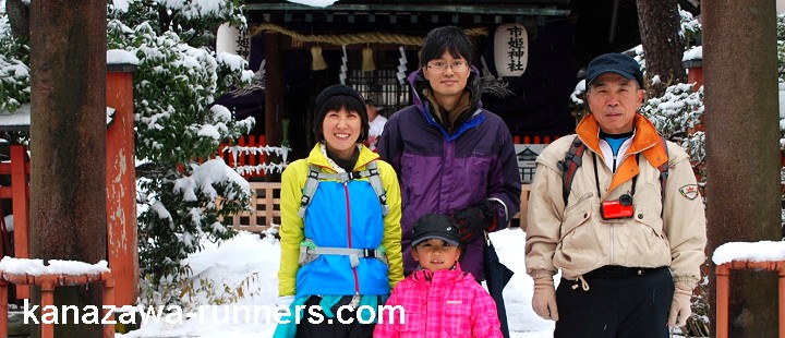 2015年の走り初めは、初詣ランニングです。金沢市内の10社寺を巡り、一年の健康を祈願しながら親睦を深めます。当初は会員の行事、今ではランニング愛好家の行事として定着し、家族連れも多く新たな仲間も増えています。今回の参加者は105名。久々の大雪(?)の影響でしょうか。 この大会は、天候が一番の気がかり。年末から冬型の気圧配置が続き、雪が積もった正月です。元旦の夕方から雪も小康状態になり、2日の早朝は、曇りで気温はマイナス、ときおり小雪が混じる程度です。今回は、久々に雨具・長靴でなく防寒着・スノトレで出かけます。 撮影機材を持ってのランニングなので、途中でショートカットを入れ、7神社を巡りながら撮影しました。フィニッシュは兼六園の『内橋亭』でぜんざいをいただきました。 |