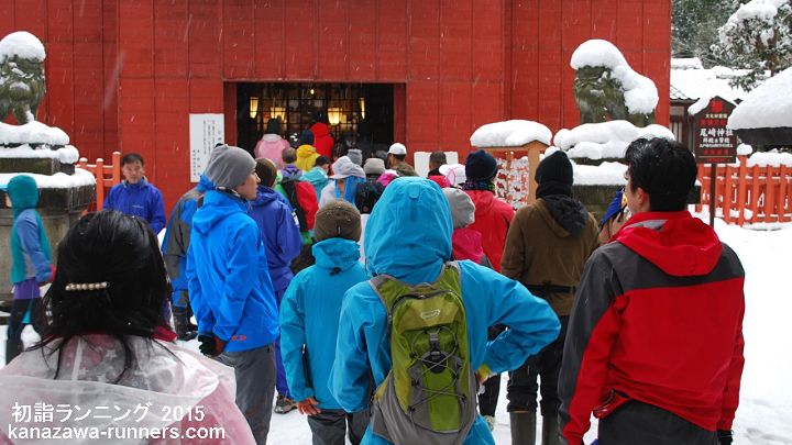 | 2015年の走り初めは、初詣ランニングです。金沢市内の10社寺を巡り、一年の健康を祈願しながら親睦を深めます。 1977年、会員の行事で始まった初詣ランニング。今ではランニング愛好家の行事として定着し、家族連れも多く新たな仲間も増えています。 今回の参加者は105名。久々の大雪(?)の影響でしょうか。 この大会は、天候が一番の気がかり。年末から冬型の気圧配置が続き、雪が積もった正月です。元旦の夕方から雪も小康状態になり、2日の早朝は、曇りで気温はマイナス、ときおり小雪が混じる程度です。今回は、久々に雨具・長靴でなく防寒着・スノトレで出かけます。 撮影機材を持ってのランニングなので、途中でショートカットを入れ、7神社を巡りながら撮影しました。フィニッシュは兼六園の『内橋亭』でぜんざいをいただきました。 |
