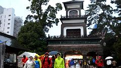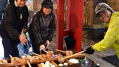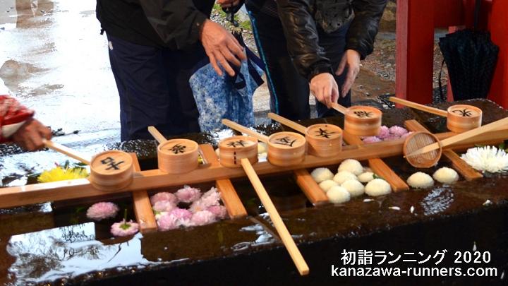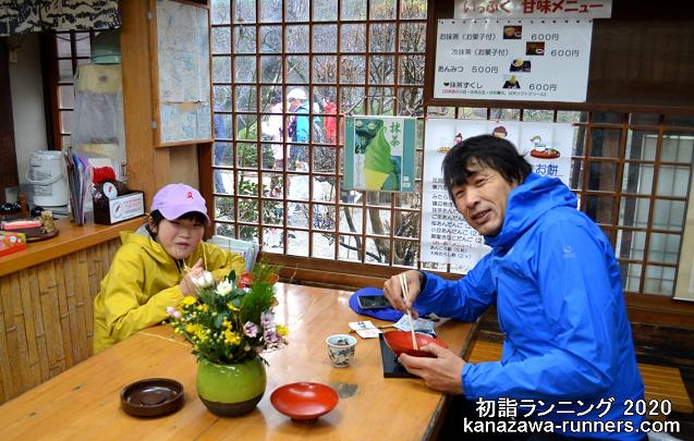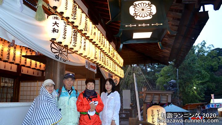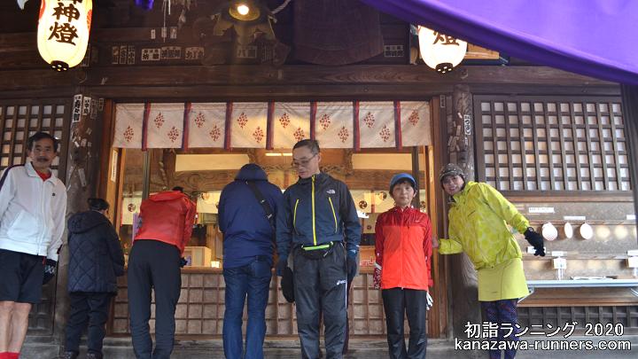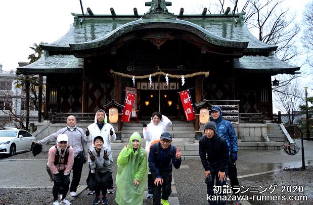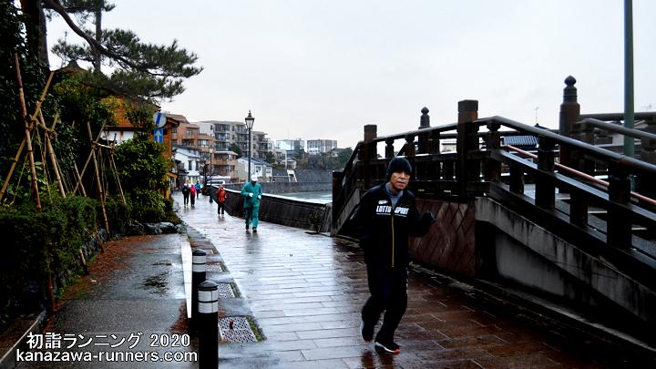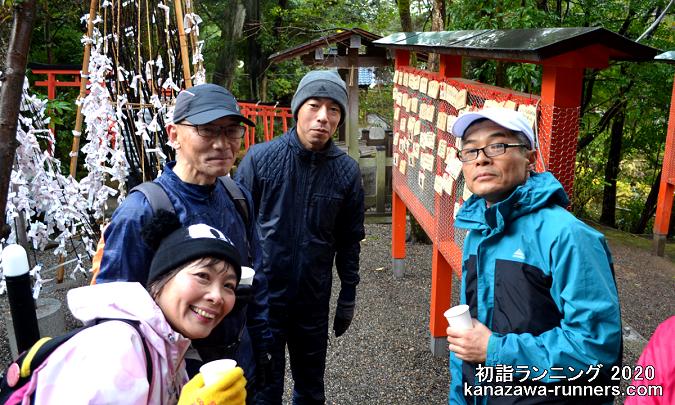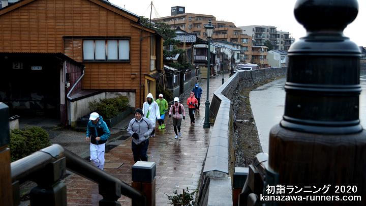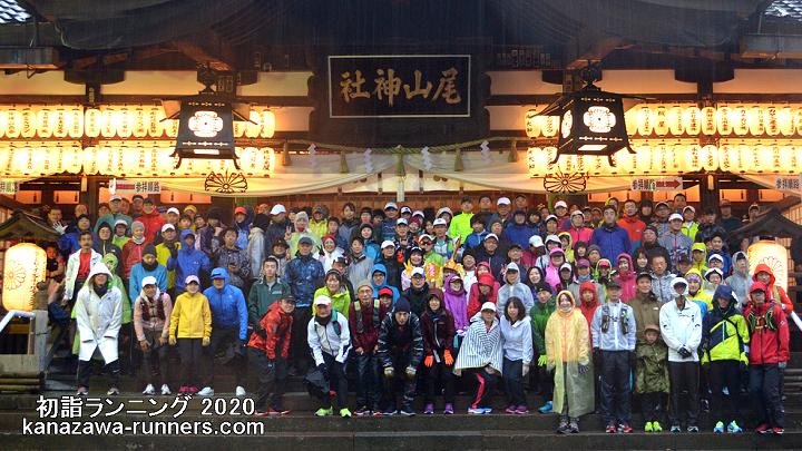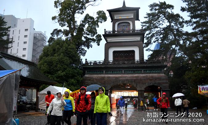 | 2020年の走り初めは、初詣ランニングです。金沢市内の10社寺を巡り、一年の健康を祈願しながら親睦を深めます。当初は会員の行事、今ではランニング愛好家の行事として定着し、家族連れも多く新たな仲間も増えています。今回の参加者は137名。 この大会は、天候が一番の気がかりです。今回も昨年とおなじく、いつもの雨模様。気温も低めです。私は、雨具着用に撮影機材を背負い傘を持ちます。途中でショートカットを入れ、5神社を巡りながら撮影ラン。フィニッシュは兼六園の『堤亭』でぜんざいをいただきました。 |