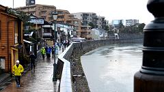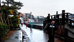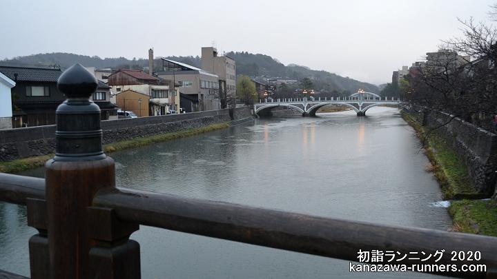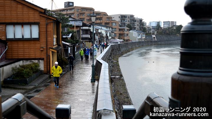 | 初詣ランのコースで風情あるのが茶屋街。浅ノ川河畔・主計町周辺はお気に入りの撮影スポット。中ノ橋で待機し、暗闇坂〜久保市乙剣宮と撮影します。ひがし茶屋街と梅の橋は今回パスしました。 | ||