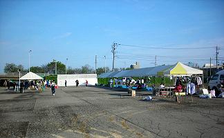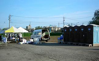 | 本部テントの様子(06:46) | 売店の準備と仮設トイレ(06:46) |