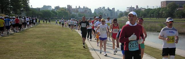 | ●スタート 金沢中心街を流れる犀川。その河川敷をコースにした制限時間のない大会です。 大豆田大橋右岸のイベント広場が大会場。 全部門(5km・10km・20km・30km・フル)が同時にスタートします。 午前8時。543人の列がゆっくりと動き始めます。マイペースで、ゆっくり・長く走る、健康ランニングにふさわしい大会のスタートです。 毎回参加される馴染みの顔。顔。顔。大会の様子をお楽しみください。 |
