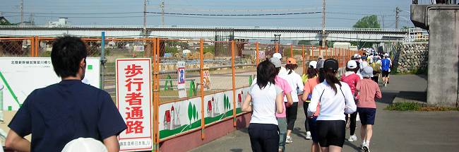 ●JR新幹線の架橋工事が始まりました。 大会のコース設定は、スタート地点から上流へ1km(犀川神社付近)、下流側に4kmです。 昨年は御影大橋の架け替え工事が終了して、スッキリしたコース状況でした、今回はJRの鉄橋横で新幹線の架橋工事が始まったことで、走路が狭まっています。 スタート直後には576人が一度に通過するので、ペースダウンと譲り合いをお願いしました。役員も総出で整理の配置につきました。 |
