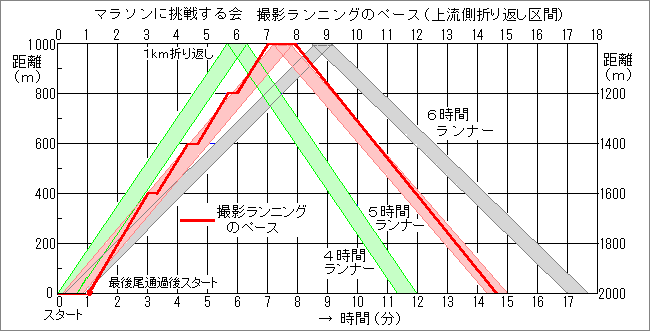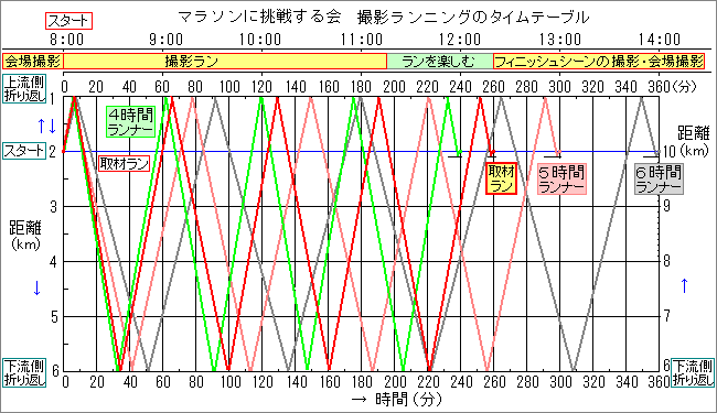 | 取材ランのタイムテーブル。折り返しコースでの対面走行を利用してシャッターチャンスを狙います。 | |