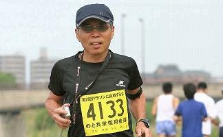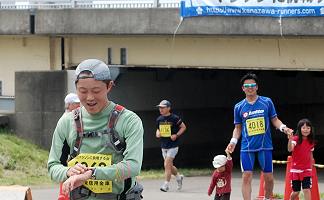 3往復目(20km〜30km)は撮り残したものや撮影チャンスとなりそうなものに絞り、走りをマラソンモードに修正していきます。これは30km以降の走りをシッカリしたものにしておきたいからです。撮影ランで乱した調子をこの10kmで静めます。この時間帯は同じペースで走っているランナーの取材タイムでもあります。どちらから参加ですか?、何回目ですか?など、応え易い質問から入ります。こうした会話は、お互いに長丁場ランの気分転換にもなります。会話しながらもフィニッシュ写真のコメントを入力します。そして後続にどれくらいのランナーがいるか、最終ランナーの表情や減速具合なども計算に入れながら走ります。 4往復目に入るときに、カメラを大会本部に預けて身軽になります。残り12kmは景色とランニングを楽しむゆとりタイム。山々の遠望や川筋の変化、ランナーとの対面応援。そして昨年5月から始めたランニング・エクササイズを心掛けます。地面に上手にエネルギーを加えるためのタイミングに関するもので、前脚が着地した瞬間に後ろ脚のヒザが前脚を素早く追い越す。この脚の切り替えを意識すると、ペースも安定し気力を維持しながらも気持よく走れます。 |