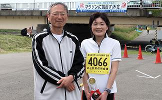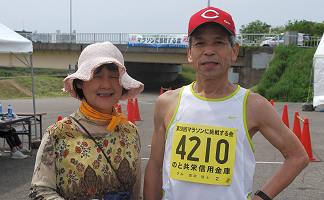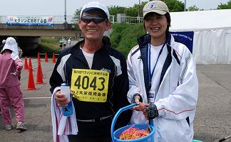 当会主催の大会に常連のSさん夫妻。 今回は満を持しての初マラソンに挑戦です。 すれちがう度に応援します。30km過ぎからきつそうでしたが、無事完走。 20kmに参加したご主人の祝福を受けます。 |