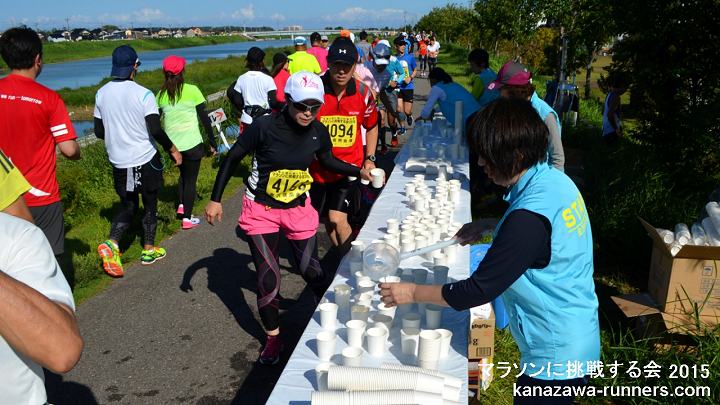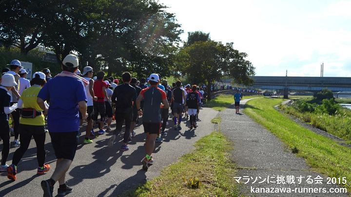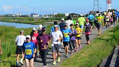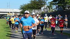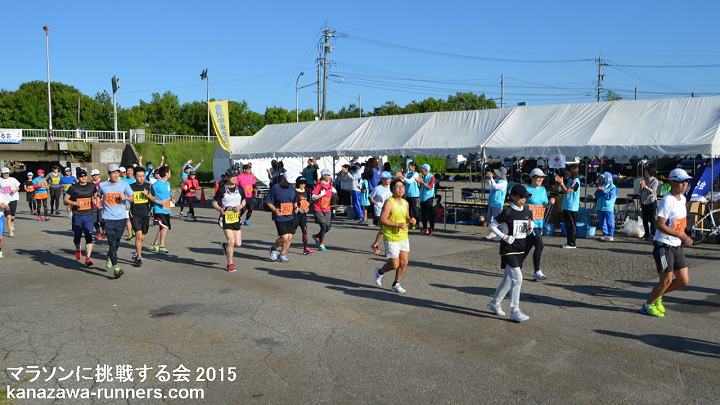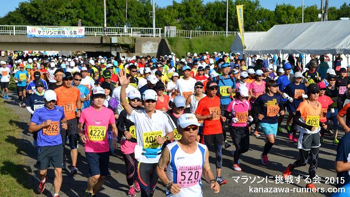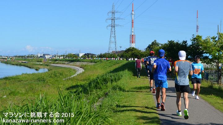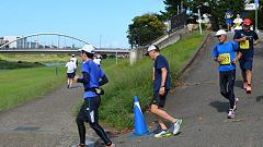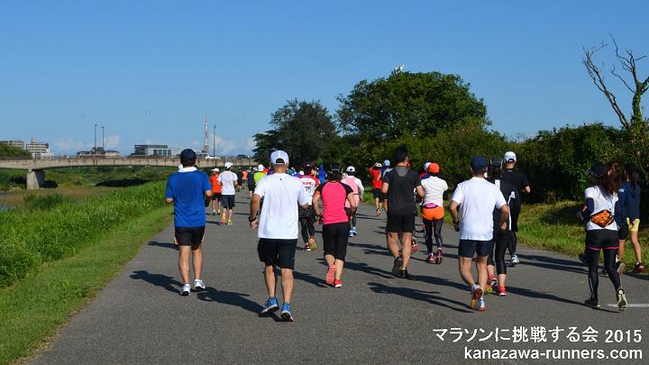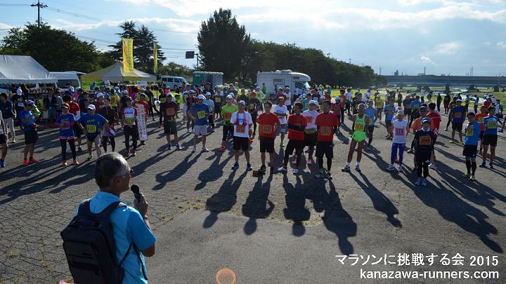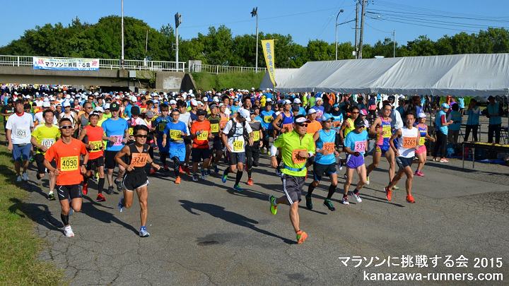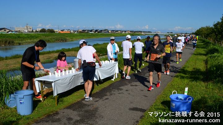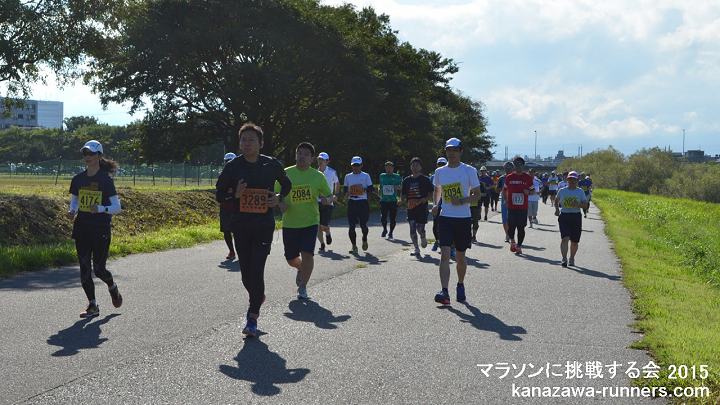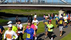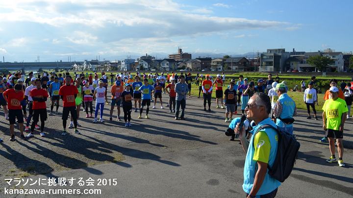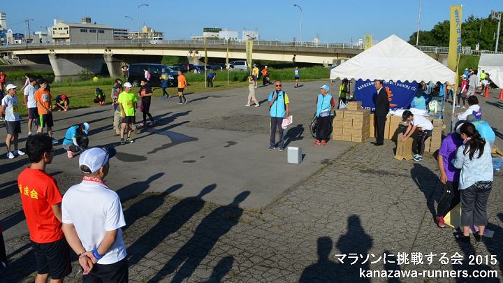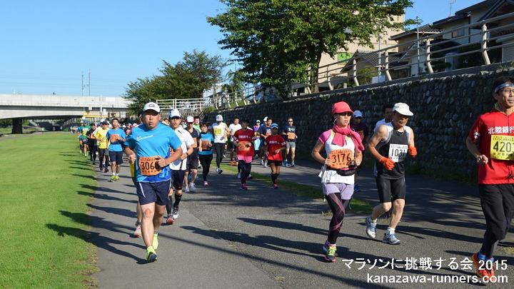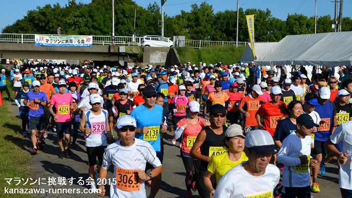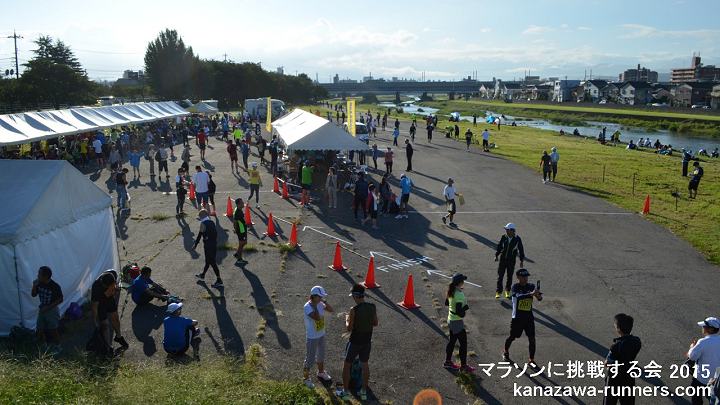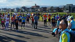 | 最近のマラソンブームにのって、近年に新設された石川県内開催の能登和倉マラソン(3月)・加賀健勝マラソン(4月)と春の大会が盛況になってきました。秋の大会がないことから、秋の開催を検討しました。 5月3日の大会として親しまれてきました『マラソンに挑戦する会』を、2012年大会(31回)から秋の大会に変更。9月23日に開催していたトリムマラソン大会を『マラソンに挑戦する会』として、当会主催の距離大会を一本化しました。 この秋、11月23日に金沢マラソンの初開催を迎えます。ランナーの皆さんは期待を持って準備中と思います。当大会は、それに先立って、42.195kmを経験する、まさにマラソンに挑戦しようという練習の場となります。1ヶ月前に30km以上を走っておくことで、マラソン完走に大きく近づけます。 金沢市の中心部を流れる犀川河川敷は季節や景色の変化を楽しめるコースです。30km以上のマラソン練習には、給水等の支援が不可欠です。 当大会は、会員のボランティアによる手作りの大会運営をしています。その気になれば誰でもマラソンに挑戦できることを目標に、地域のランナーの皆さんと一緒に『ゆっくり、長く走ること』を楽しんでいただける場を提供しようという趣旨で、開催を続けています。 10kmごと(正確には2kmと8kmごと)に荷物を置いた場所に戻れるというのは、初心者には、とても魅力(?)のあるものです。天候の変化や体調によって、いろいろな対応がとれます。 体調不調などで途中で打ち切りした場合もフィニッシュラインを通過すれば、部門(距離)変更として扱っています。但し、トロフィーは申込み部門(距離)のものを用意しているので、切り替えできません。次回は、シッカリ走ろうとの新たな挑戦の証(アカシ)として活用ください。 大会のコースは、都心を流れる河川敷コースです。趣のある橋がたくさんあって変化をつけてくれます。緩やかなカーブがあるだけで直線に近いコースは、公認が不要なくらい距離はきわめて正確です。曲がり角はなく、ショートカットするようなコース取りも不要です。10kmごとに気持ちを入れ替えて42kmに挑戦するという基本を体得しましょう。 今回は、富山マラソンの新設もあり、富山県からの参加者が多くなっています。また東京から参加のMさんは、金沢マラソンの下見を兼ねての参加でした。 |