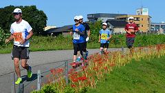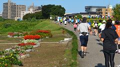 | 【犀川ふれあいパーク】 犀川歩走会の皆さんが整備されている花壇です。色鮮やかな花がランナーを応援してくれています。彼岸花(まんじゅしゃげ)も満開です。好天に恵まれ、ランナーを取り込んだ写真をシッカリ撮影できました。 |