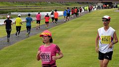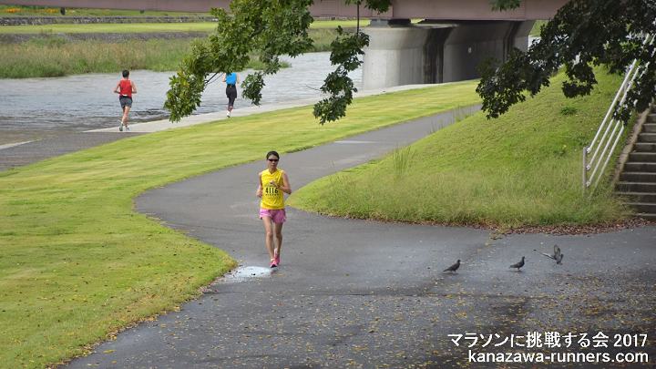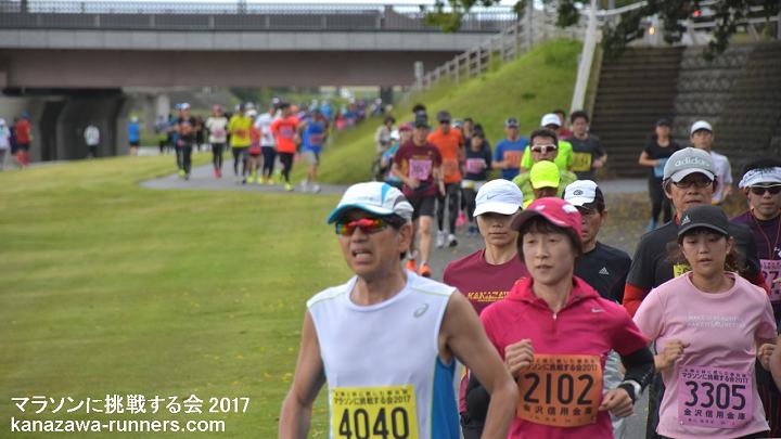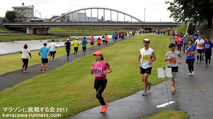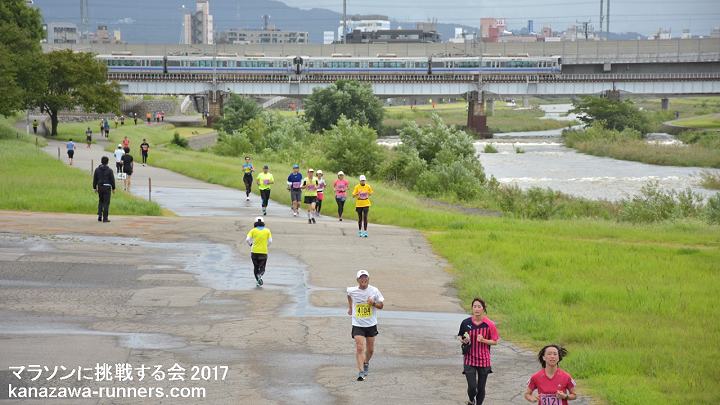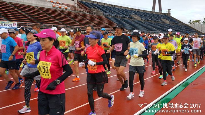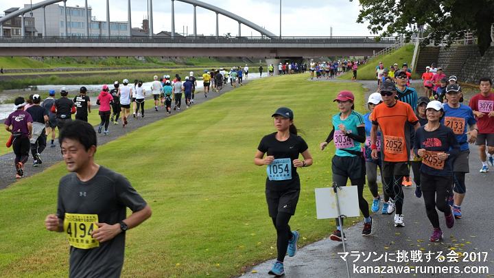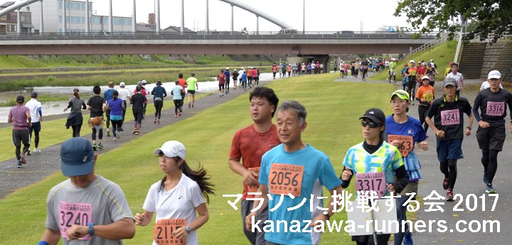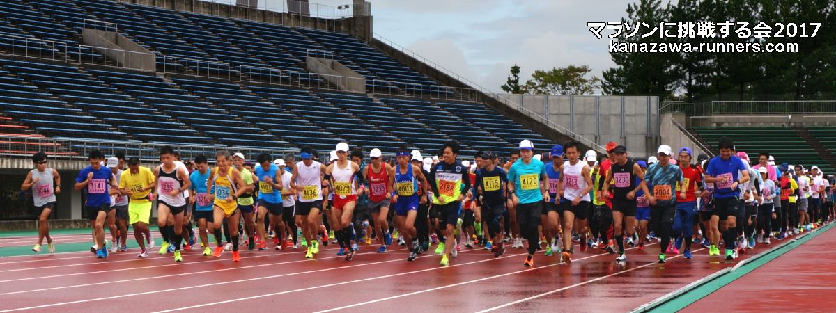 | 最近のマラソンブームにのって、近年に新設された石川県内開催の能登和倉マラソン(3月)・加賀健勝マラソン(4月)と春の大会が盛況になってきました。秋の大会がないことから、秋の開催を検討しました。 5月3日の大会として親しまれてきました『マラソンに挑戦する会』を、2012年大会(31回)から秋の大会に変更。9月23日に開催していたトリムマラソン大会を『マラソンに挑戦する会』として、当会主催の距離大会を一本化しました。 2015年秋、金沢マラソン・富山マラソンが初開催を迎えました。当大会は、それに先立って、42.195kmを経験する、まさにマラソンに挑戦しようという練習の場として利用できます。1ヶ月前に30km以上を走っておくことで、マラソン完走に大きく近づけます。 2015年大会は、富山マラソンの新設もあり、富山県からの参加者が多くなっています。また東京から金沢マラソンの下見を兼ねての参加もありました。 金沢市の中心部を流れる犀川河川敷は季節や景色の変化を楽しめるコースです。30km以上のマラソン練習には、給水等の支援が不可欠です。ランナーに必要な給食は現役ランナーが選んだものです。ビッグ大大会では趣向をこらしても、全てのランナーが口にできません。ここではそういうことはありません。バナナや柑橘類をどのタイミングで摂るかも工夫してみましょう。 当大会は、会員のボランティアによる手作りの大会運営をしています。その気になれば誰でもマラソンに挑戦できることを目標に、地域のランナーの皆さんと一緒に『ゆっくり、長く走ること』を楽しんでいただける場を提供しようという趣旨で、開催を続けています。 10kmごとにフィニッシュ地点近くを通過するというのは、初心者には、とても魅力(?)のあるものです。天候の変化や体調によって、いろいろな対応がとれます。 体調不調などで途中で打ち切りした場合もフィニッシュラインを通過すれば、部門(距離)変更として扱っています。但し、トロフィーは申込み部門(距離)のものを用意しているので、切り替えできません。次回は、シッカリ走ろうとの新たな挑戦の証(アカシ)として活用ください。 大会のコースは、都心を流れる河川敷コースです。趣のある橋がたくさんあって変化をつけてくれます。緩やかなカーブがあるだけで直線に近いコースは、公認が不要なくらい距離はきわめて正確です。曲がり角はなく、ショートカットするようなコース取りも不要です。10kmごとに気持ちを入れ替えて42kmに挑戦するという基本を体得しましょう。 今年(2017)から、発着会場が県陸上競技場になります。河川敷コースへの途中には横断歩道があるので、スタート時は交通規制も必要になりました。西部緑地公園というイベント会場を利用することで、駐車場の確保に苦労することもなくなります。運用エリアが広くなり、安全管理の業務も増えたことで、新たな運営体制を組みました。まず無事故で大会を催す。反省点を次年度に生かすというのが今回のスタンスです。 今回は種目をマラソン・32.195km・22.195km・12.195kmの4種目としました。2.195kmは競技場と河川敷コース間の往復距離です。変則ですが、マラソンでの残り2.195kmの感覚を味わってみるのも楽しいと思います。同時スタートなので、全種目の制限時間は6時間です。 昨年に続き、今回も台風の影響がありました。台風18号が未明に接近・通過。天候は回復しましたが交通機関の運休もでました。 |