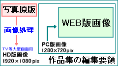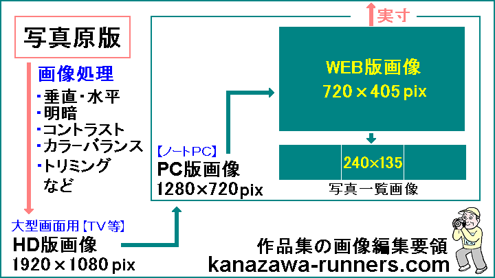 シリーズで紹介している『マラソン大会』の写真集。今回の撮影はXXX枚です。WEB掲載では、主要写真をスライドショー形式で楽しめるよう編集します。写真集はHD版(1920×1080ピクセル)を制作します。ハイビジョン画面サイズで、これを大画面のテレビで鑑賞。細部もくっきり、迫力も出て結構楽しめます。同時にPC版(1280×720ピクセル)を制作します。 次に、PC版を縮小しWEB版(720×405ピクセル)に仕上げます。小さなサイズになりますが、雰囲気は伝わると思います。お楽しみください。 |