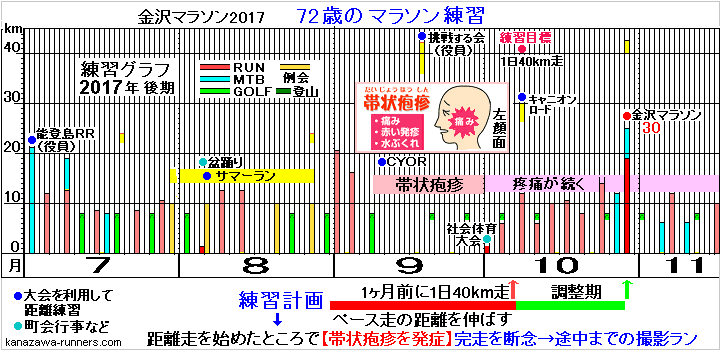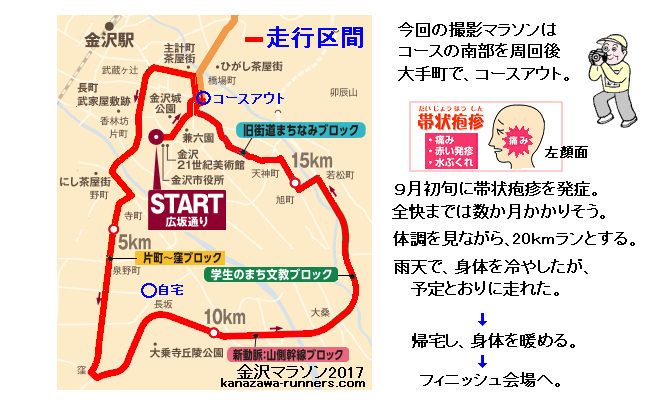 ○距離練習にはいったところで帯状疱疹を発症。途中までの撮影ランに計画変更。 金沢マラソン2017は、マラソン通算30回目にあたる。その記念の回に、完走できない体調に落ちいってしまった。毎回、大会1ヶ月前に1日40km走を行っている。そこから疲れを抜きながらスピード練習に入る。今回は3週間前に設定し、9月から距離練習に入った。まず21キロ走。気温も高かったが、まずまずのペース、疲労感も少なく良い感触だ。2日あけて16km走。3日あけてゴルフの競技会。スポーツの秋は忙しい。 その夜から左顔面に激痛。帯状疱疹を発症した。10月になって瘡蓋がとれ、痛みも小康状態になった。汗をかけるようになったので少し走ってみた。足運びは軽かったが心肺機能の低下はわからない。3日あけて12km走。走るのに不安はなさそうだ。経験から、3週間で42kmを走れる体力に仕上げるのは無謀。体調も病人と同じだ。とりあえず、20kmの撮影ランができるようにしておこう。 |
