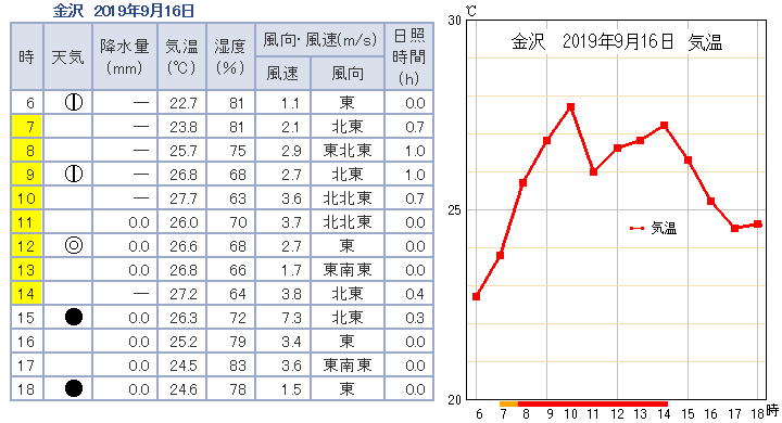 | ■マラソンに挑戦する会:気象データ | 金沢 2019年9月16日 アメダス |