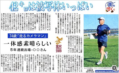 | ●金沢マラソンの直前、編集長の練習が新聞で紹介されました。=2019/10/23 | ||