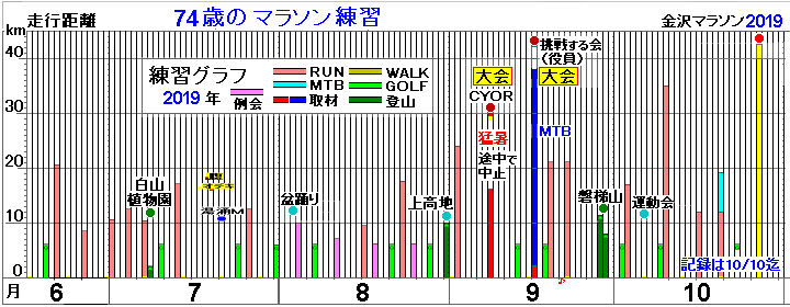 | ●金沢マラソン2019の参加が決まっています。今年も撮影ランを楽しむ計画です。 走力確保は暑い夏の練習をどう過ごして秋の練習にそなえるかが大切です。 ○6月にハーフ走。夏季の練習量を下げる前の練習です。いつでも20kmを走れることを確認します。 ○8月は奥卯辰山サマーランニング。芝生の丘陵公園をクロスカントリー走。30℃を超えるので距離は短くしても、フォームに留意してシッカリと走ります。後半は、野尻あずささんを講師に招いて『クロカン教室』。写真取材を楽しみます。 ○9月初旬のCYOR大会で30km走の練習を組みます。これに備えて、8月後半から、気温をみながら距離を伸ばしていきます。34℃の猛暑の大会となり、途中で中止となりました。私は16kmでした。 ○『マラソンに挑戦する会』=金沢マラソンの練習の場として最適ですが、編集長は競技役員に専念します。スタート時の撮影ではコースに出るまで2kmをラン。MTB(自転車)でコース監察と撮影で36km。後半、脚を痙攣したランナー2人をケアしてあげたので4往復分40kmにわずか届きません。 ○大会を終えて、今度は私の練習。21km走×2本。2日あけておこなうのは高齢ゆえの疲労防止です。写真の整理は石川県健民運動推進本部や協賛社への報告用を優先します。写真集のWEB掲載はしばらくお預けです。 ○9月末、磐梯山登山。 勤労者体育協会の登山行事に久々に参加します。初日は曇、2日目は雨模様。樹林帯が多いので、私は雨傘だけで対応できました。直登にちかいコースで、持久力の練習、気分転換になります。ここでも写真集を整理して、事務局に渡します。 ○ゴルフ競技会は定期的に組み込んでいます。最近読んだゴルフ指導書には、ゴルフはストレッチと心得よ。飛距離が落ちて、焦る気持ちを慰めてくれるアドバイスです。 ○町会連合会の行事も加わり、多忙です。 健康イキイキ教室(月1回、公民館で開催)を手伝っている。運動の場面では、指導することも。参加者の笑顔を狙いながら、各回の様子を撮影。公民館のWEBサイトに提供。写真を見た人から参加したいとの問い合わせがあったと、効果を聞く。 公民館の文化祭が10月19・20日に開催される。その写真展に4点応募する。金沢マラソン2018から2点、上高地撮影バスから2点。プリント作品は久々の制作だ。 10月6日は社会体育大会(運動会)。6時に防災倉庫からテント2張りを会場となる小学校に運び出し、設営。9時開会。ここでも撮影担当でグランド内を行き来して、参加者の真剣な表情や笑顔を追う。16時、テントを防災倉庫に仕舞って、業務終了。 ○10日。1日35km走=最後の距離練習。 金沢マラソンの1ヶ月前に予定していたが、行事が重なり、10月の初旬となった。74歳には疲労を抜く期間が必要。6日の運動会、9日のゴルフ競技会の疲労の上に持久走を加える。10日、午前に20km、午後に15km。快晴、24℃と暑い日となったが、なんとかこなせた。 |