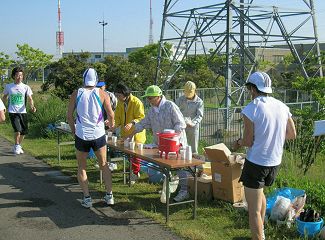 | ●エードステーションは2箇所 ランナーをサポートするエイドステーションは2箇所設けられています。5kmの往復コースなので、10kmあたり4回の利用が可能です。フルマラソンでは16回の計算です。 エイドステーションを取り仕切る野村さんは、1981年のホノルルマラソンを4時間台で完走、以来そのサポート体制を勉強・実践されているベテランです。梅干は野村さんの自家製が提供されています。 |