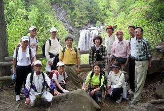 | 三本滝を見てから全員集合の記念撮影。この後、数班に分かれて、高原を楽しみます。 | ||||||||