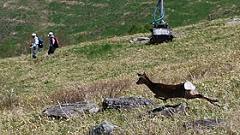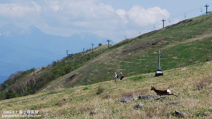 6:00金沢(中央公園)出発。11:30前に車山高原駐車場に到着。ここで数班に分かれて車山登山や高原散策・ランニングなどを楽しみます。集合場所は霧ケ峰駐車場15:00です。編集長は登山グループ。車山から湿原の散策を楽しみます。この季節は花が少ないのが寂しい。コナシ(ズミ)の花が目をひきつけます。 頂上を少し下りたところで、鹿が飛び出して、駆けていった。タイミング良くカメラに収めた。途中で大回りしたので、霧ケ峰駐車場には集合時間の15分前となった。 |