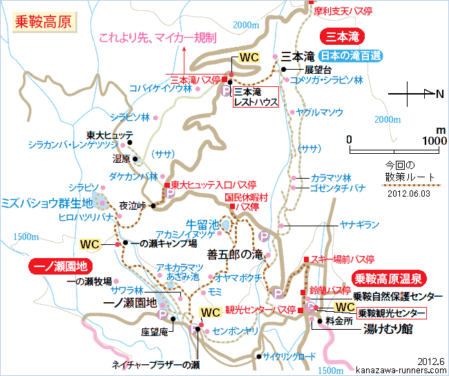| 懇親会を兼ねたバス旅行。今回は乗鞍高原です。この行事では初めて雨の予想される天気ですが、10:00〜14:00までの自由時間を、高原散策やランニングを楽しみます。 乗鞍高原に到着すると、最初に番所(ばんどころ)の大滝へ。ランニング組は観光センター手前から三本滝の往復ジョギングに向かいます。散策組は善五郎の滝の近くでバスを降りて、2班に分かれて、散策開始。編集長は健脚組に参加しました。集合場所はネイチャープラザ一の瀬。写真集をお楽しみください。 |