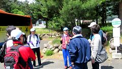 | 今回の参加者=わさび農園駐車場=背景の雲の合い間に常念岳が見えます。 | ||