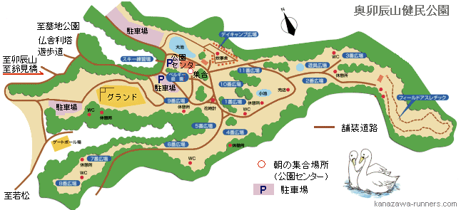 | @周回コースは、11番広場あたりがスタート。ここから花時計の前を通って南下し、5番広場から南西へ8番広場へ緩やかに下っていきます。ここが一番低い広場です。ここを周回後、西に向って4番広場2番広場へと登りが続きます。そしてフィールドアスレチック場の門へ。3番広場から公園北側を回って元の場所へ戻ります。 この周回距離は約2.5km。所要時間は健脚組で約15〜17分。 実際のスタートは、準備体操を行った場所からになります。広い芝生を自由にコース取りして走ります。この周回を繰り返します。 |