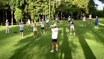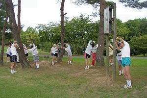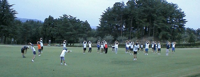 早朝の公園はさわやかです。ウグイスの鳴き声も聞こえます。Bグループの準備運動。 |