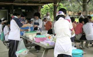 | 準備体操のあと、2グループに分かれて12.5kmと5kmのハイキングランを楽しみました。 ランニング後は、懇親屋外パーティを開きました。 |
