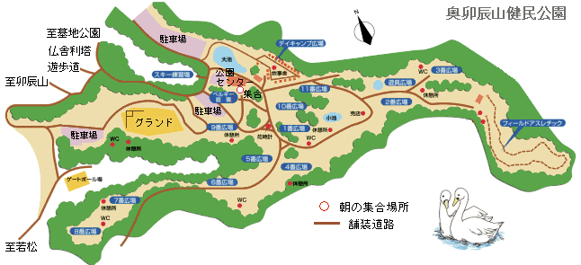 | 公園事務所から地図を入手しました。練習コースを紹介します。 @周回コースは、11番広場あたりがスタート。ここから南下し、南西へ8番広場へ緩やかに下っていきます。西に向ってフィールドアスレチック場の門まで、登りが続きます。ここから公園北側を回って元の場所へ。この周回を繰り返します。 Aフィールドアスレチック場は、コースに従ってスタートからゴールまで。登り下りの連続する坂道・階段を走ります。 |
