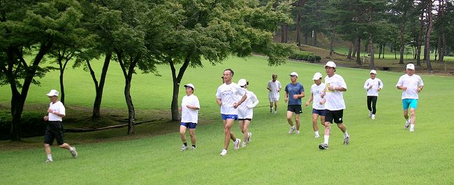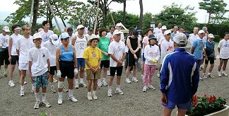 | からっと晴れた朝です。24℃だった気温がグングン上がってきます。整理体操後、参加者の記念撮影をおこないました。写真データの請求は編集部へメールしてください。 |