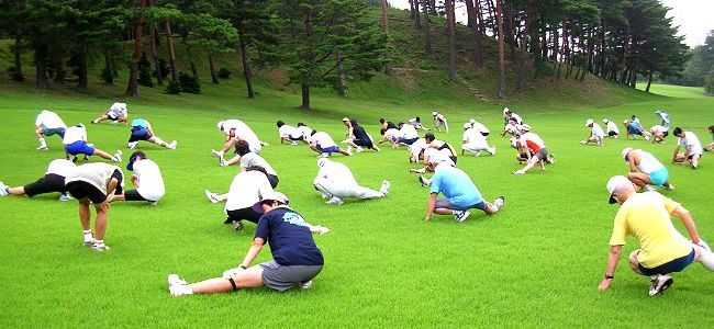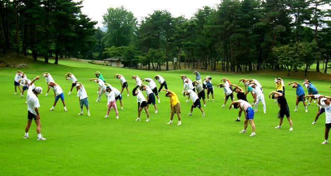 | 芝生公園に移動して、全員でストレッチ。入念に準備体操します。 |