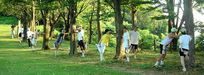| 7月初旬からの梅雨もそろそろ明けそうです。8月は、練習会場を奥卯辰山健民公園に移して、サマーランニングです。アップダウンのある丘を使って走力を高めます。 サマーランニングは、誰でも参加できる練習会。走力別に、3クラスに分かれて練習します。 初日は、県高齢者JC・金沢レディースJC・金沢RCや一般のランナーも参加してのスタートです。 |